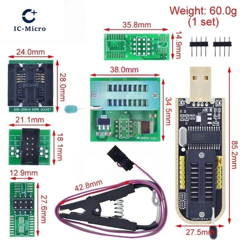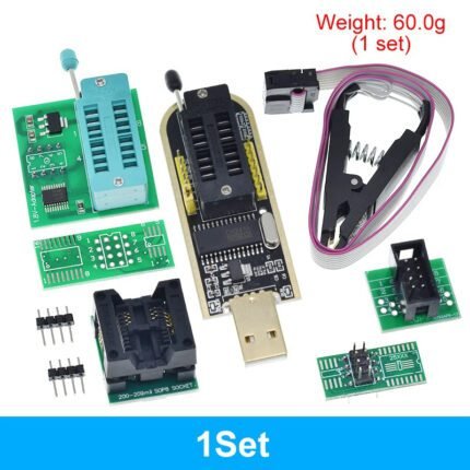 Il comprend l’adaptateur CH341A USB, un adaptateur SOIC8 / SOP8, un clip SOP8 avec câble, un adaptateur 1.8 V, et l’interface ZIF / support DIP8 pour faciliter l’accès aux puces sans soudure.