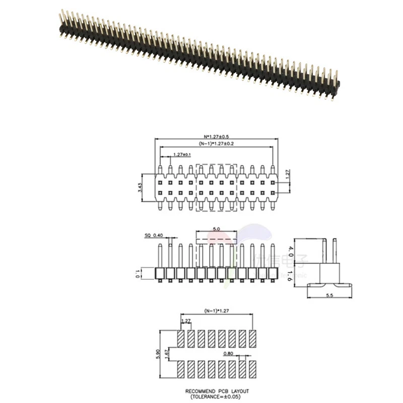 | Connecteur mâle droit 2×40 – pas 2.54 mm | Mâle | 2 | 80 (2×40) | 2.54 mm | Droit | H. plastique ~2.5 mm | Double-rang sur PCB, shields |